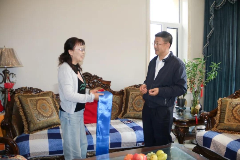 在全区优秀共产党员俞红兵家中,盟委副书记、盟长白海林详细了解他的健康状况和生活情况,鼓励他继续发扬老一辈党员同志的光荣传统和优良作风,当好表率、发挥余热,多关心支持阿拉善经济社会发展,多为家乡建设建言献策。今年80岁的格日勒是国家级非遗项目马鬃绕线堆绣唐卡传承人,曾荣获“全国三八红旗手”和全区非物质文化遗产保护工作先进个人、“北疆工匠”等多项荣誉。白海林在详细了解非遗作品的制备工艺、市场营销和发展前景等情况后,鼓励老人继续做好非遗文化的保护、传承和发展工作,打造更多优秀产品,培养更多新鲜血液,不断提高阿拉善非遗文化的吸引力和影响力。