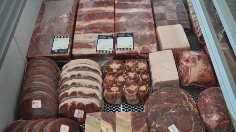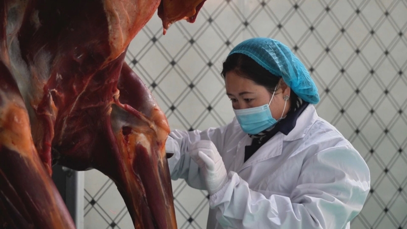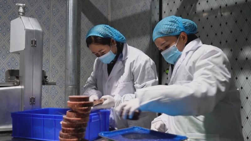 在苍天牧歌种养殖农牧民专业合作社生产车间内,工作人员正在做骆驼肉精细分割与包装工作,各个环节井然有序,现场一片繁忙景象。