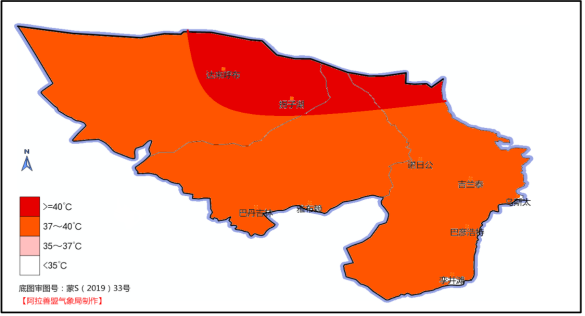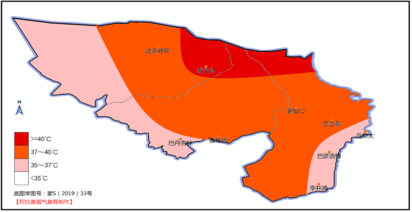 16日至18日:新一轮全盟大范围高温热浪来袭,其中16日额济纳旗中部和东部、阿右旗中部和东部、阿左旗偏北部和吉兰泰地区有37℃以上高温;17日高温最强,全盟大部地区有37℃以上高温,额济纳旗东部、阿右旗偏北部、阿左旗偏北部有40℃以上高温(见图2);18日阿右旗东部、阿左旗南部、高新区、孪井滩示范区有37℃以上高温,阿左旗西南部和吉兰泰有40℃以上高温。