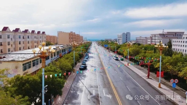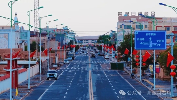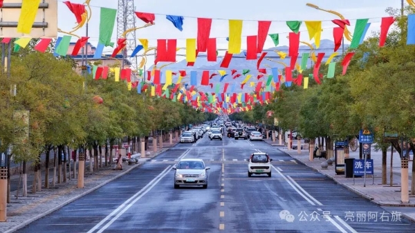 为营造庄重热烈的节日氛围,阿拉善右旗精心布置,共计摆放仿真花1000余束、彩带8000米以及红旗110面。一面面鲜艳的国旗迎风飘扬,一条条绚丽的彩带随风舞动,不仅为阿拉善右旗的大街小巷增添了靓丽色彩,更彰显出全旗人民对祖国母亲炽热的热爱与诚挚的祝福。